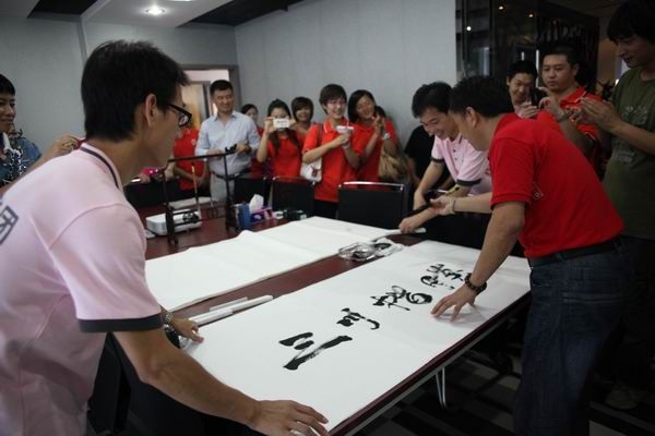 楷膜揭牌儀式合影(從右到左依次是:悍高集團(tuán)董事長(zhǎng)歐錦鋒、北京御木坊張文峰總經(jīng)理、中國(guó)電腦配件行業(yè)領(lǐng)軍企業(yè)金河田公司總經(jīng)理方植勛、楷膜科技有限公司謝偉鋒總經(jīng)理、中國(guó)十大品牌策劃人之一閆真誠(chéng)教授、上海浪舟集團(tuán)總經(jīng)理兼上海新滬商會(huì)會(huì)長(zhǎng)陳波、廣州盛斯隆實(shí)業(yè)有限公司連文化總經(jīng)理、唐山黃二餐飲公司老總黃建國(guó)、廣州黑鉆石影視有限公司總經(jīng)理馬強(qiáng)、廣州星海音樂(lè)學(xué)院魏老師、格力空調(diào)廣州區(qū)域總經(jīng)理范漢唯。)